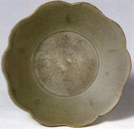 根據(jù)唐代墓葬資料,當(dāng)時(shí)已通行撇口碗。這種碗口腹皆向外斜出,壁形底,制作工整,是中唐時(shí)出現(xiàn)的新品種。它與敞口斜壁形底盤和撇口平底碟器形風(fēng)格相同,成為一套新穎的飲食用具。同時(shí)還有口沿外翻,碗壁近于斜直,矮圈足的翻口碗和斂口淺腹的平底碗等。到了晚唐,碗的形式越來越多,如荷葉形碗、海棠式碗和葵瓣口碗等。荷葉形碗,邊緣起伏,碗面坦張,很像初出水的荷葉。海棠形則形如盛開的海棠。這件花瓣口碗是越窯碗中的一種,造型優(yōu)美,胎釉細(xì)膩,為越窯瓷器中的精品。