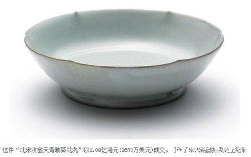 八、2012年4月5日香港蘇富比拍賣(mài)公司一件北宋汝窯天青釉葵花洗成交價(jià):2.08億港元(2670萬(wàn)美元),創(chuàng)下宋代瓷器拍賣(mài)的新紀(jì)錄。如下圖: