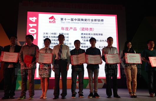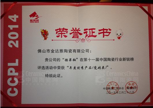 2015年3月28日,第十一屆中國陶瓷行業(yè)新銳榜頒獎典禮暨中國制造•佛山論壇在佛山新媒體產業(yè)園隆重舉行。金達雅陶瓷原創(chuàng)糖果釉瓷磚憑其全新技術,閃亮肌理喜獲“年度優(yōu)秀產品(瓷磚類)”大獎,成為中國陶瓷行業(yè)2015年陶瓷新品中亮眼之星。