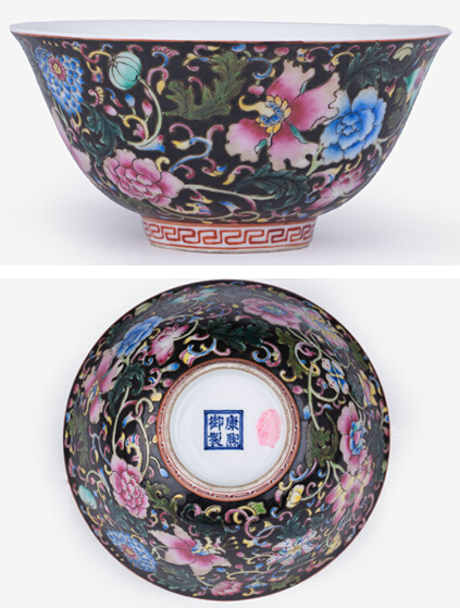 此藏品口沿微外撇,直壁,圈足,以烏金釉為地,其上又以粉彩繪畫“花卉”圖案,充分展現(xiàn)出康熙時期宮廷繁麗富貴之特色,此件粉彩作品即為康熙時期國力昌盛時所燒制,是頗受帝王喜愛的御窯宮廷陳設(shè)賞器,整體畫工精美,純凈瑩潤的墨彩和粉彩花卉的搭配相映成輝。施彩瑰麗濃艷,紋飾繁縟,盡顯清代宮廷華麗之風(fēng),底足內(nèi)有青花楷書“康熙年制”四字雙行款,堪稱康熙御瓷,保持完整,實屬少見之重器極為難得,相類似的作品在各大館藏及拍賣中罕見,極具收藏和投資價值。