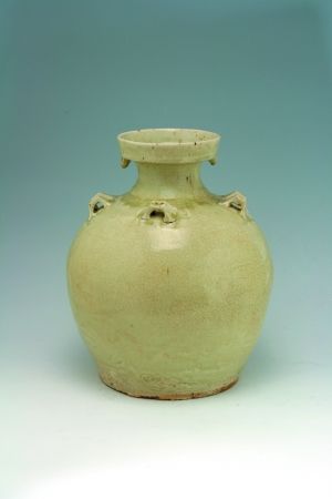 盤口、直頸、豐肩、園鼓腹、平底;盤口下對稱有兩條小系,肩上四面有六條橋型系,呈兩雙兩單狀排列;通體施青釉,釉層肥厚潤澤,開有細(xì)密的深色紋片,積釉處呈綠色;平底無釉露淺灰色胎,胎質(zhì)較為酥松有孔洞。