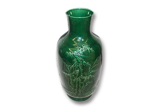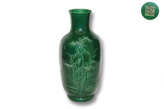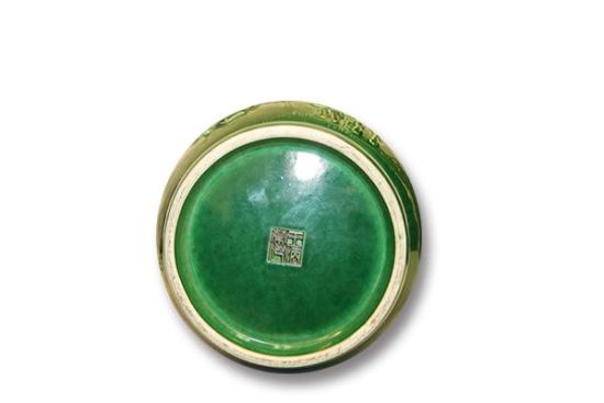 藏品王炳榮款綠釉賞瓶通體施綠釉,釉質(zhì)晶瑩,造型古樸穩(wěn)重,渾厚大器?雌渚G色,綠色青翠,綠中泛藍(lán),如孔雀羽毛,又如綠松石之綠藍(lán),非常鮮亮,極其美麗。藏品彌足珍貴,如此精作大件的綠釉瓷器保存至今完好無(wú)缺,可謂寶中之寶也。