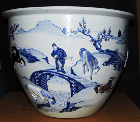 康熙朝青花瓷將分水畫(huà)法演繹得愈加完美。分水畫(huà)法又稱(chēng)混水,從繪瓷工藝分析,青花尤以山水紋最具特色,雖然僅用青料一色,但因有濃淡色階而具丹青之韻;焖玫拿P頭比一般的毛筆大,以便于含水。繪畫(huà)時(shí),筆尖不沾瓷坯,而是擁著一汪青花料游走,青料的濃淡程度不同,燒成后就有了濃淡的色階。制釉原料是不透明的白漿水,在高溫下它才會(huì)變得透明無(wú)色,所以青花瓷在燒成后才能看到效果,這于繪畫(huà)技法上無(wú)疑難度頗高。