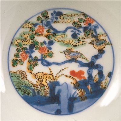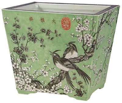 清代官窯瓷中也有壽帶鳥的形象(圖2),又例如南京博物院收藏的慈禧太后專用瓷——大雅齋湖綠地黑白彩梅花壽帶鳥紋長(zhǎng)方花盆;ㄅ韪29.5、口面37×28.7厘米,同樣造型紋樣的花盆有大小不同的4種規(guī)格;ㄅ鑳(nèi)壁罩白釉,將花盆外壁的四面展開就是一幅手卷。畫面上,老梅盤虬伸展,三只壽帶鳥(花盆的正面僅看到2只)顧盼合鳴,生氣盎然。大雅齋瓷中還有相同紋樣、造型的黃地黑白彩花盆。