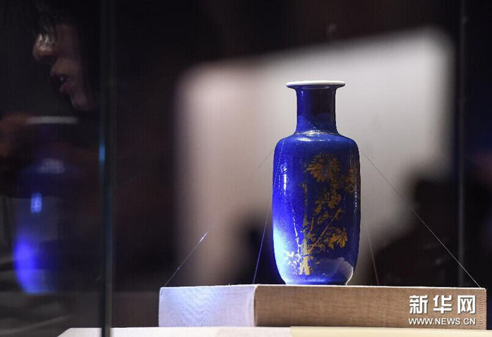 7月14日,觀眾在欣賞故宮博物院藏的“灑藍釉描金小棒槌瓶”。