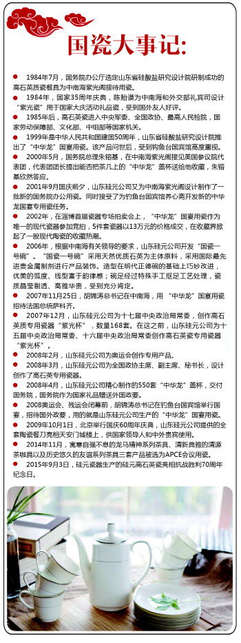 硅元公司自主研發(fā)并獲得國(guó)家發(fā)明獎(jiǎng)的高石英瓷作為國(guó)家用瓷,成為中南海紫光閣、釣魚臺(tái)國(guó)賓館專用瓷器,成為中共中央政治局、中央軍委、全國(guó)政協(xié)等黨和國(guó)家領(lǐng)導(dǎo)人用瓷首選,并作為國(guó)禮贈(zèng)送外國(guó)政要。這充分顯示了硅元瓷器的技術(shù)實(shí)力、產(chǎn)品品質(zhì)和文化內(nèi)涵,也代表了中國(guó)當(dāng)代陶瓷的工藝水平和民族特色,無愧“當(dāng)代國(guó)瓷”的稱號(hào),成為了淄博陶瓷乃至中國(guó)陶瓷的一面旗幟。