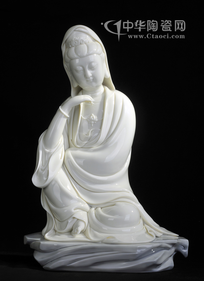 簡介:林建平代表作之一,第十五屆中國(國家級)工藝美術大師精品博覽會金獎,觀音坐于巖上,手作扶下巴狀,頭微微歪向一邊,靜靜思考。作品刻畫細致,觀音衣物線條流暢,自然真實,作品手刻簽名。