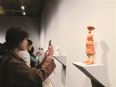 9日,“絲路瓷語——2015國(guó)際當(dāng)代陶瓷藝術(shù)精品展”在北京勞動(dòng)人民文化宮太廟藝術(shù)館開幕,展覽共展出來自22個(gè)國(guó)家的70多位陶瓷藝術(shù)家近200件當(dāng)代藝術(shù)精品。 圖為觀眾在一件陶瓷作品前拍攝。