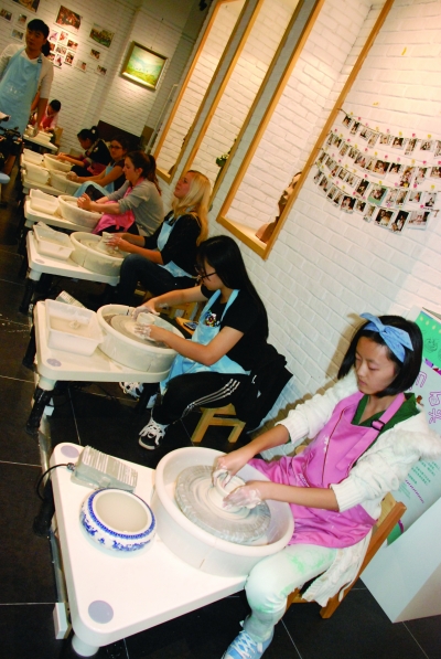 陶藝體驗(yàn)吧是北京陶瓷藝術(shù)館內(nèi)最具特色和吸引力的空間。據(jù)介紹,北京市朝陽區(qū)教委已將該區(qū)部分中小學(xué)的藝術(shù)實(shí)踐課安排于該館,從周一到周五,每天都有幾個班級的學(xué)生在此過把“玩泥巴”癮——細(xì)膩滑潤、充滿韌性的泥巴在手中塑形,“手隨泥走,泥隨手變”,逐漸拉坯成型;成型晾干后可以進(jìn)行陶瓷繪畫,隨性而發(fā);陶藝制作完成后,經(jīng)過十幾天的風(fēng)干,再放入專門的電窯進(jìn)行燒制,最終將成品交給體驗(yàn)者。陶藝體驗(yàn)吧提供制瓷教學(xué)、陶土塑形體驗(yàn)、陶瓷繪畫體驗(yàn)、作品展示等服務(wù)。