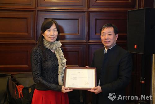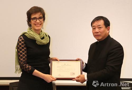 河南博物院院長田凱為策展人溫蒂女士頒發(fā)聘任證書。