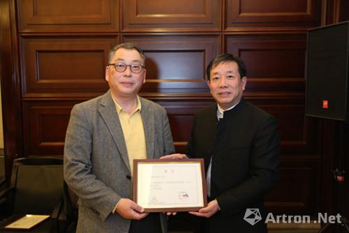 河南博物院院長田凱為原韓國陶瓷財團展覽與藝術(shù)總監(jiān)徐廷杰(左)頒發(fā)展覽專家聘任證書。