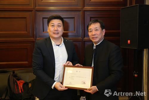 河南博物院院長田凱為臺灣中華陶藝協(xié)會榮譽理事長蘇正立(左)頒發(fā)展覽專家聘任證書。