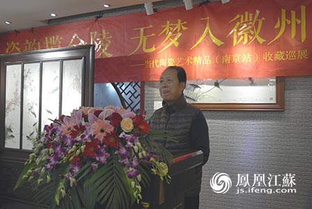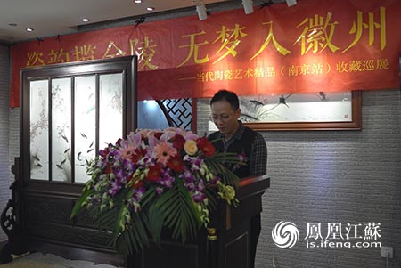 由南京市安徽商會、《文化徽商》全國理事會、 九三學社江蘇畫院主辦,江西景德鎮(zhèn)瓷印象有限公司承辦,蘇寧易購獨家冠名的“瓷韻攬金陵,無夢入徽州”當代陶瓷藝術精品(南京站)收藏巡展于2015年12月11日在九三學社江蘇畫院隆重展出,南京安徽商會常務副會長、南京廣廈集團董事長沈長明先生、南京知何堂文化投資有限公司董事長周峰等人參加了開幕式并發(fā)表致辭。