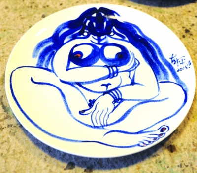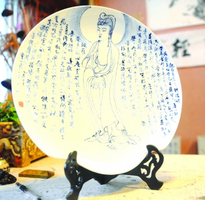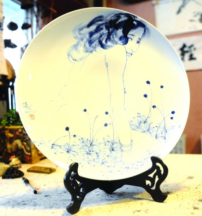 昨天下午,記者在劉南平位于鹽阜路附近的工作室中,見到他剛從景德鎮(zhèn)帶回來的10余件青花瓷,記者當(dāng)場被深深地震撼了,雪白的瓷素雅的青花,看上去格外賞心悅目。其中的數(shù)件方形青花瓷花瓶令記者有些詫異,對青花瓷有所了解的人都知道,圓形易做,方形則難,燒制的時候,方形根本無法把握,可劉南平的幾件方形花瓶卻是一氣呵成,并未有廢品。同時,在這10余件青花瓷中,有幾件作品有別于大眾所理解的青花瓷,瓷器上繪有西畫的畫面風(fēng)格,濃烈而又張揚(yáng),給人一種視覺上的沖擊。另外,有兩個大盤子則分別是用線條勾勒出的觀音像和一名坐著的眼神有些憂郁的年輕女性。