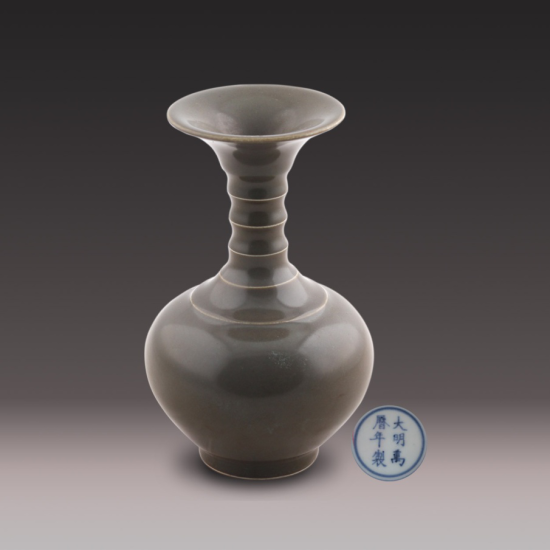 瓶撇口,長頸,鼓腹,造型優(yōu)美,線條優(yōu)雅,頸部與肩部都以旋紋來裝飾,有層次感。此瓶形制端莊,通體施茶葉末釉,釉面發(fā)色沉穩(wěn),有高雅文士的氣質(zhì),美感獨特。款識是“大明萬歷年制”六個正楷大字,該藏品具有較高的收藏價值。