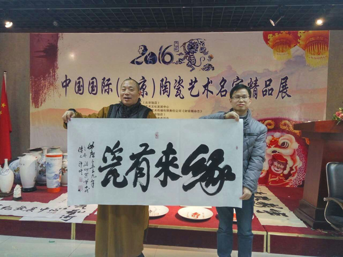 1月20日下午13時(shí)30分現(xiàn)場還進(jìn)行了藝術(shù)家筆會(huì)活動(dòng),溈仰宗第十代傳人凈修法師和中華陶瓷網(wǎng)/博緣陶瓷總經(jīng)理柯維太先生進(jìn)行了親切友好的互動(dòng),凈修法師還為博緣陶瓷現(xiàn)場題字:緣來有瓷。