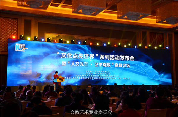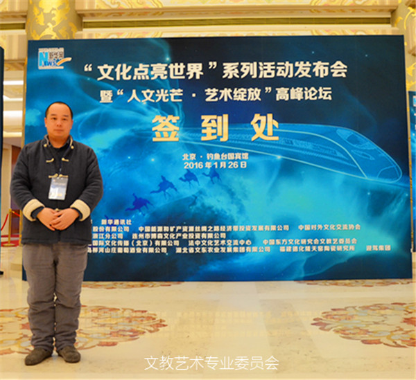 2016年1月26日,由新華網(wǎng)主辦,中國(guó)東方文化研究會(huì)文教藝術(shù)專(zhuān)業(yè)委員會(huì)等單位協(xié)辦的“文化點(diǎn)亮世界”系列活動(dòng)發(fā)布會(huì)暨“人文光芒•藝術(shù)綻放”高峰論壇在北京釣魚(yú)臺(tái)國(guó)賓館芳華苑隆重舉行。