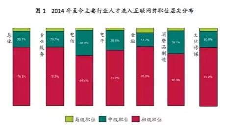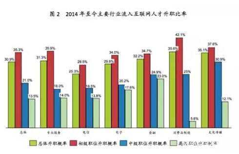 報告指出,專業(yè)服務業(yè)、電信業(yè)、電子業(yè)、金融業(yè)、消費品制造業(yè)和文化傳媒業(yè)從業(yè)人員是流入互聯(lián)網(wǎng)最多的六大群體,職場新人不僅轉(zhuǎn)行互聯(lián)網(wǎng)的人數(shù)最多,升職空間也最大;高學歷能夠增加升職優(yōu)勢;行業(yè)資深人士往往以成熟的管理能力和開闊的視野在跳槽后獲得升職。