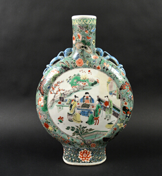清光緒五彩飲中八仙抱月瓶,高38cm,抱月瓶的外形最早源自宋時(shí)期流行于西夏的陶制馬掛瓶,左右雙系,用以掛于馬鞍之側(cè),極具民族特色。明代以青花為裝飾,結(jié)合抱月瓶自身的獨(dú)特風(fēng)格,發(fā)展成為陳設(shè)用藝術(shù)品。抱月瓶以永宣時(shí)期最負(fù)盛名。此件五彩飲中八仙抱月瓶整體造型張弛有度,端莊秀麗,線條自然流轉(zhuǎn)。外繪五彩飲中八仙圖,畫工細(xì)膩。