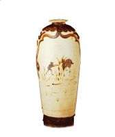 瓶高63cm,口徑7.8cm,足徑13cm。瓶唇口外撇,短頸,豐肩,直腹,寬圈足,沙底。瓶肩部繪一周黑彩花瓣紋,兩組下垂卷葉紋如垂蔓一般將瓶腹分為兩幅畫面:一幅是小猴立行在泛著漣漪的水邊似在張口呼喚,小鹿則駐足點點蘆葦旁觀望;另一幅是飛翔的雙雁掠過水面欲落覓食。