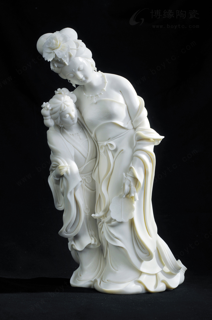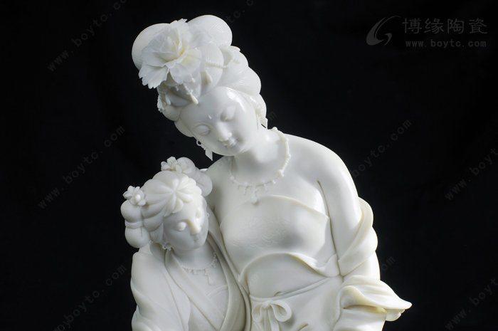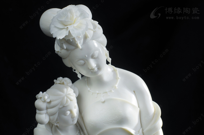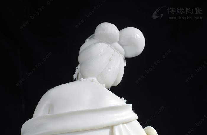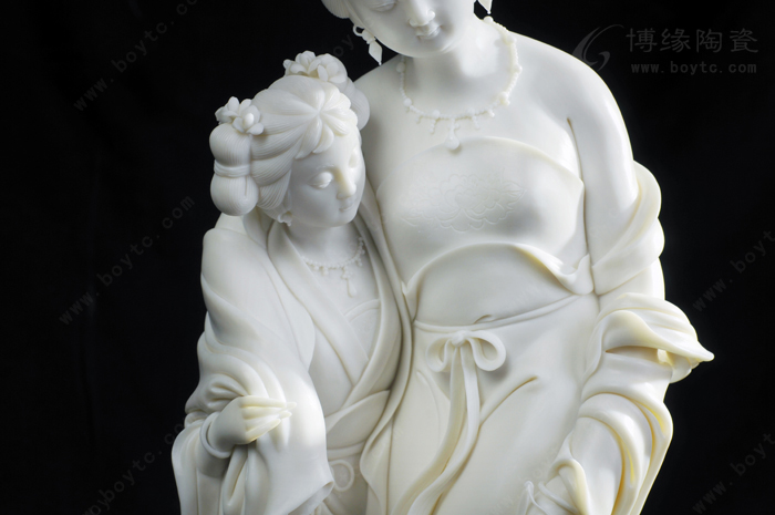所以,許瑞卿作品自然也有了“山湖祖”對雕塑的精雕細(xì)刻的傳統(tǒng)風(fēng)格。那么,如何通過精雕細(xì)刻創(chuàng)作出具有價值的陶瓷藝術(shù)精品?許瑞卿認(rèn)為首先在創(chuàng)作上應(yīng)對作品的造型、整體和細(xì)節(jié)的關(guān)系作推敲。細(xì)節(jié)是作品整體不可分割的重要組成部分,缺乏細(xì)節(jié)的巧妙安排,作品就會缺少吸引力。表現(xiàn)楊貴妃醉酒后,由丫鬟扶住行走的瞬間的作品《貴妃醉酒》便是此技法的代表作之一。作品通過多個細(xì)節(jié)把貴妃醉酒后的形態(tài)充分地展示了出來:披肩褪至臂間,露出渾圓的香肩臂膀,豐韻的身軀輪廓分明,凹凸有致,豐滿而不臃腫;稍稍傾斜的身軀把重心置于丫鬟身上,體現(xiàn)貴妃醉酒把握不住的步態(tài),卻依然嫵媚而雅致;高高隆起的發(fā)髻和質(zhì)地飄逸柔軟的衣裙彰顯出楊貴妃的高貴。在這件作品中,大到整體的構(gòu)思造型,小到發(fā)髻牡丹、頸上環(huán)佩、腰間飄帶都是精微細(xì)致的,極具真實感。另一件作品《靜思觀音》也是如此。坐于巖石之上的觀音,略微右傾,輕舉右手,若有所思,其發(fā)絲、發(fā)飾、胸飾、衣紋等無一不是精雕細(xì)刻,讓人贊嘆。