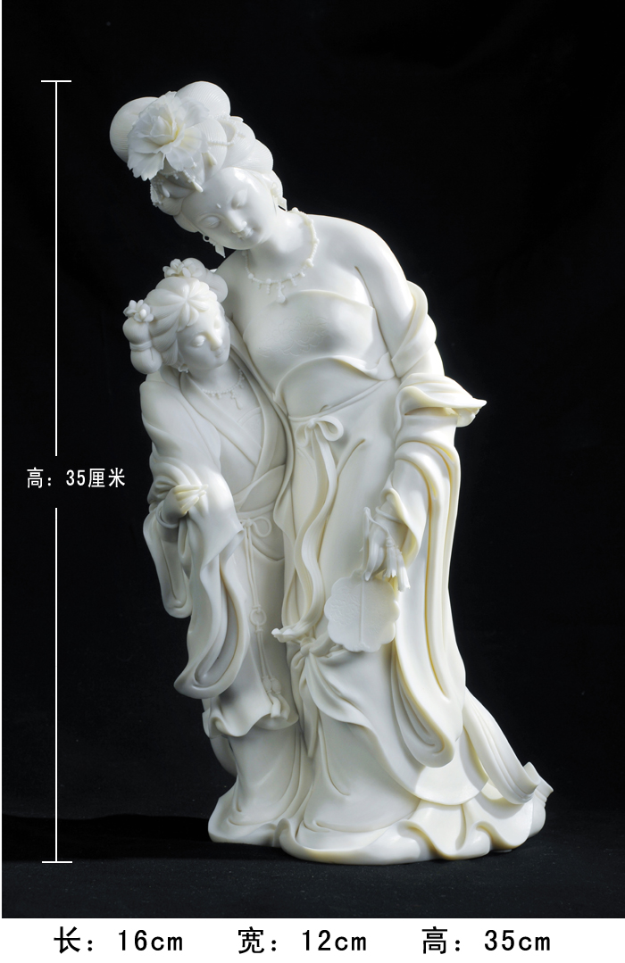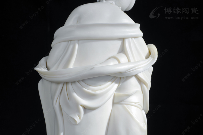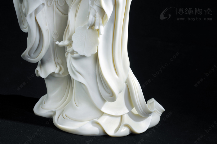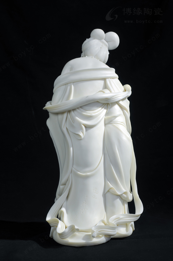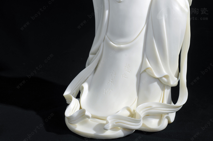 許興泰的瓷塑藝術(shù)既繼承了許氏家族“山湖祖”雕塑的精雕細(xì)刻,又繼承看德化傳統(tǒng)瓷塑的圓融飄逸,并力求在二者之間找到平衡點。除此以外,許興泰還在繼承中進(jìn)行藝術(shù)創(chuàng)新,他的復(fù)古式成型創(chuàng)新以及影響整體的局部創(chuàng)新均開創(chuàng)了瓷塑的自由時代。尤其是他人物造像的大底座和長飄帶,充分發(fā)揮了線條對人物造型的重要作用,“以線刻體、以體托線、線體結(jié)合”,烘托出人物的精神氣質(zhì)和內(nèi)在性格,表現(xiàn)出其非凡的創(chuàng)造力,形成了自己的典型風(fēng)格和特征。