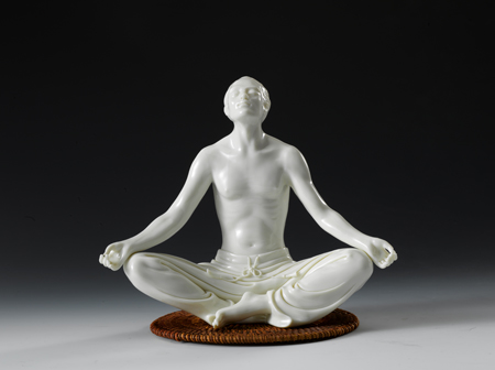這就是不滿足于停留在傳承層面上,而是不斷開闊自己的眼界與識度,自覺地在文化修養(yǎng)、社會活動與人生閱歷等方面充實自己,形成自己更加開放的心境與更加豁達(dá)的胸懷,形成從工到藝、以藝帶工的思想升華,從而走出一條具有鮮明時代特征與個性情懷的瓷塑創(chuàng)造之途!抖U心》系列作品便是在傳統(tǒng)之余的創(chuàng)新之作。人物盤膝而坐,雙手?jǐn)傞_輕輕放在膝蓋上,頭微仰面向天空,眼睛微閉,靜心之意撲面而來。此作品借鑒了瑜伽的姿勢造型,卻在精雕細(xì)刻與抽象寫意之間相生相融,相輔相成。