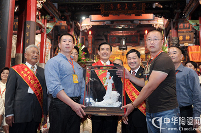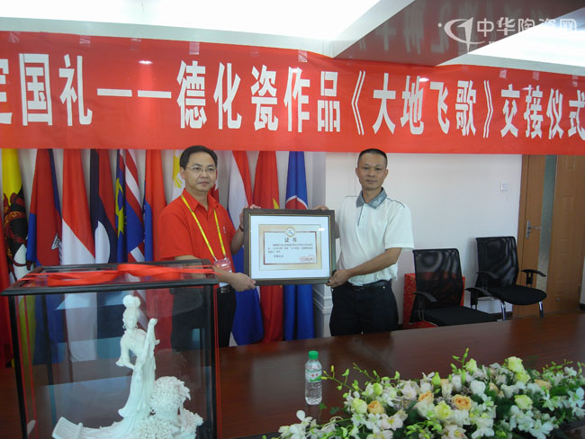 《大地飛歌》成為“2008年中國(guó)—東盟博覽會(huì)指定國(guó)禮”,贈(zèng)送給東盟各國(guó)國(guó)家領(lǐng)導(dǎo)人,并載入東盟史冊(cè);2010年泉州霞洲媽祖宮赴臺(tái)灣臺(tái)南大天后宮祭奠之時(shí),德化瓷塑作品《大地飛歌》被作為禮品贈(zèng)送給國(guó)民黨主席馬英九。