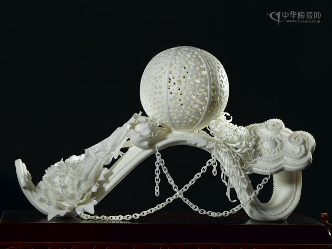 蘇志強(qiáng)的作品《圓滿如意》就是揉合中華傳統(tǒng)文化的元素,以如意棒為主體,圓球代表圓滿,蘊(yùn)含著“萬(wàn)事如意”、“美美滿滿”的美好意象。作品純手工制作,精雕細(xì)刻,造型和諧,用璀璨的瓷花襯托柔軟鏈條的動(dòng)感,剛?cè)嵯酀?jì),松密結(jié)合,令人賞心悅目。作品并以德化特有的溫潤(rùn)如玉的“中國(guó)白”為胎質(zhì),潔白細(xì)膩,素凈淡雅。