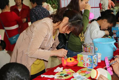筆者看到,嘉賓們都仿佛變身藝術(shù)家一樣,一手拿著畫筆,一手托著調(diào)色板。面對(duì)著陶瓷娃娃,一筆一筆描繪出象征活力與熱情的繽紛色彩。只見喜洋洋、悠悠豬、叮當(dāng)貓、紅太郎、灰太狼……形象各異、妙趣橫生的陶瓷娃娃形象,在嘉賓們靈巧的雙手下逐漸成型。一些小嘉賓的手上更是沾上了五顏六色的色彩,煞是好看。濃厚的藝術(shù)氛圍伴隨著家長與孩子歡快的交談與爽朗的笑聲,一幅幅幸福溫馨的畫面呈現(xiàn)在了人們的面前。