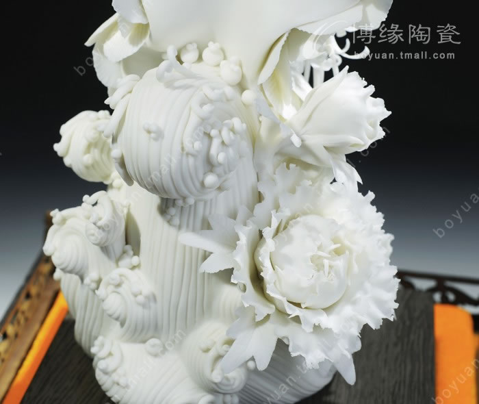蘇志強善于揉合中華傳統(tǒng)文化的諸多元素,在瓷塑作品中取如意為主體,配以葫蘆,構(gòu)思簡單明了,主題“百福如意”呼之欲出。作品并以雍容華貴的牡丹、嬌艷欲滴的玫瑰點綴其間,展現(xiàn)一派欣欣向榮的景象,蘊含著祥瑞吉慶之意。