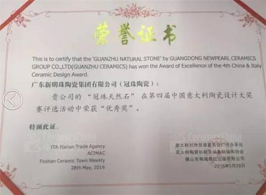 5月28日晚,由陶城報與意大利對外貿(mào)易委員會,意大利陶瓷機械及設(shè)備制造商協(xié)會,傾力打造的第四屆中意陶瓷設(shè)計大獎賽召開。冠珠陶瓷天然石瓷磚榮獲優(yōu)秀獎。