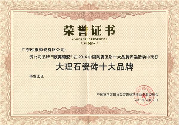 歐美陶瓷憑借卓越的品質(zhì)、優(yōu)秀的服務(wù)、先進的設(shè)計理念,亦贏得了專業(yè)人士和消費者的一致認(rèn)可。2016年,歐美陶瓷先后榮獲中國房地產(chǎn)500強開發(fā)企業(yè)500強首選住宅陶瓷系統(tǒng)服務(wù)商、2013-2015年度時代地產(chǎn)優(yōu)秀供應(yīng)商稱號、中國陶瓷十大品牌、中國大理石瓷磚十大品牌殊榮、廣東省著名商標(biāo)、國家強制性產(chǎn)品“3C”認(rèn)證、中國綠色建筑陶瓷推薦產(chǎn)品、國際知名品牌、中國輕工業(yè)陶瓷行業(yè)(瓷磚)十強企業(yè)等多項榮譽,這無疑又是一個實力的見證。在廣東歐雅陶瓷集團全力推動下,更加彰顯企業(yè)的雄厚實力與社會形象。