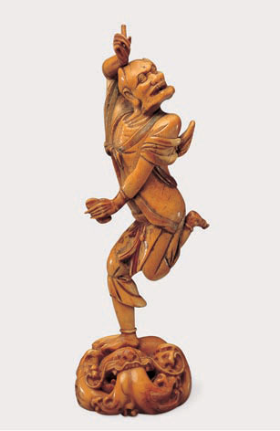 明末,是中國歷史上章回版畫小說的創(chuàng)作高峰,著名的神魔小說《西游記》就是嘉靖——萬歷年代問世的鴻篇巨制。小說中描寫了許許多多鬼的身影,以至于當(dāng)時(shí)的畫師們,根據(jù)這些鬼影,勾勒出了固定的鬼之形象。其實(shí)不僅是在瓷器上,在當(dāng)時(shí)許多工藝品中都有著“魁星”的身影,如下圖這件象牙雕魁星,在形象、動(dòng)態(tài)各方面都具有明末魁星形象的典型特征,加之神情刻畫生動(dòng)細(xì)膩,可以說是同類題材中的代表作。