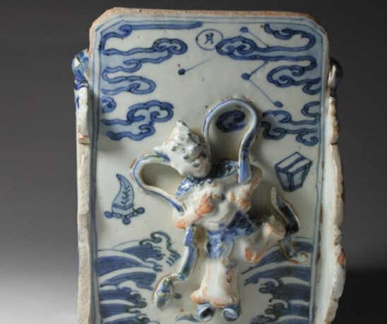 這件瓷片標(biāo)本是明代成化年間的,出土于北京市南鑼鼓巷附近。瓷畫中的人騎在水中的魚身上,寓意就是“獨(dú)占鰲頭”,也就是科舉時(shí)代的“中狀元”?婆e時(shí)代,經(jīng)殿試由皇帝欽點(diǎn)為進(jìn)士中一甲第一名的狀元,謂之“獨(dú)占鰲頭”。