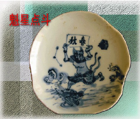 到了明代晚期,“獨(dú)占鰲頭”的瓷畫已經(jīng)逐漸和“魁星點(diǎn)斗”結(jié)合在一起。在科舉時(shí)代,通過參加考試以求仕進(jìn),幾乎是讀書人唯一的晉身之階,所以衍生出很多吉祥用語,如“登龍門”、 “獨(dú)占鰲頭”,等等,這其中“魁星點(diǎn)斗”的說法,非常流行。民間傳說,魁星原是一位讀書人,連續(xù)三次在科舉考試中取得“連中三元”的佳績,卻都因貌丑而被黜退,他萬念俱灰,投水自盡,感動(dòng)天神,命大鰲將其救起,升上天庭作了司職人間文運(yùn)的神祇。