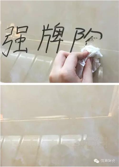 零吸污:強牌金剛釉II代產品成熟的二次燒超晶技術讓坯底更硬,物理性能更穩(wěn)定,更不易吸污。我們用記號筆在金剛釉II代產品表面隨意寫了幾個大字,隨后用抹布輕輕一擦,瓷磚表面又光潔剔透,污漬不會滲透到瓷磚表面,抗污性能良好。