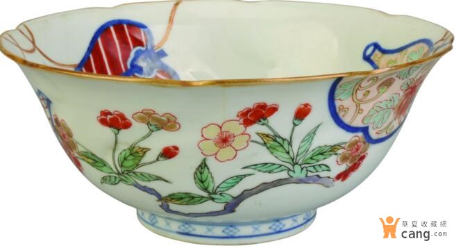 再說這件青花五彩碗上的葫蘆與扇子圖案,葫蘆紋是中國傳統(tǒng)吉祥圖案之一,因葫蘆多子,故民間象征子孫萬代之意。又以葫蘆諧音福祿,故更賦予吉祥寓意。另外,葫蘆形狀獨(dú)特而美觀,尤其是道教人士常將其掏空,作為裝水、裝酒用具,視作寶物,這更使葫蘆增添了一種神秘感。值得一提的是,清代流行一種“暗八仙”紋飾,即以八仙手中的法器、寶物為紋樣,其中葫蘆是鐵拐李的法器、扇子是漢鐘離的法器、呂洞賓為寶劍、張果老為魚鼓、曹國舅為陰陽板、韓湘子是笛子、藍(lán)采和是花籃、何仙姑是荷花。這種“暗八仙”紋飾正是始見于康熙時(shí)期,后來則多將八種法器同時(shí)出現(xiàn),此康熙青花五彩碗上的葫蘆與扇子或?yàn)?ldquo;暗八仙”紋飾的雛形階段。