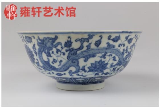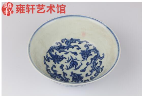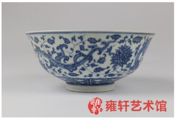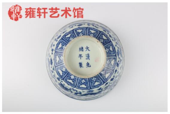雍軒藝術(shù)館最近有幸征集到一款大清光緒款“青花纏枝花卉龍紋碗”,藏品高:8.5cm,口徑:20cm。藏品通體飾以青花,胎土精細,釉汁均凈,造型工整,凝重渾厚,胎質(zhì)細膩,細砂底,整體風格是雄偉渾厚,莊重古樸。裝飾手法豐富,繪畫講究恢宏壯闊,具有很強的藝術(shù)感染力。碗身上纏枝花卉描繪得非常流暢,線條粗獷,自由活潑,畫法布局根據(jù)器型講究變化,青花云龍紋畫工展現(xiàn)夔龍靈活多變又有靈氣的規(guī)律性,顯示了當時裝飾藝術(shù)的高超及繪畫功力的嫻熟。