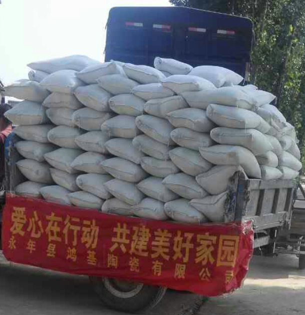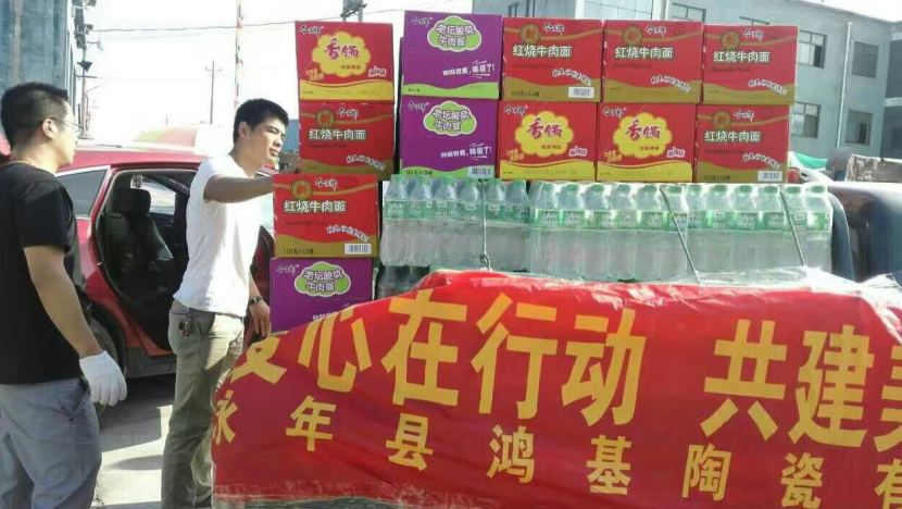 天災(zāi)無情,人間有愛。位于河北省永年縣的河北鴻基陶瓷有限公司董事長黃國汀、夏惠鳳、董行樹等公司高層對這次受災(zāi)高度重視,每天派人在各區(qū)和村及時的不停給當(dāng)?shù)貫?zāi)民送溫暖,把大米、油、方便面、火腿腸、消毒液等急需物質(zhì)及時送到災(zāi)民身邊。
