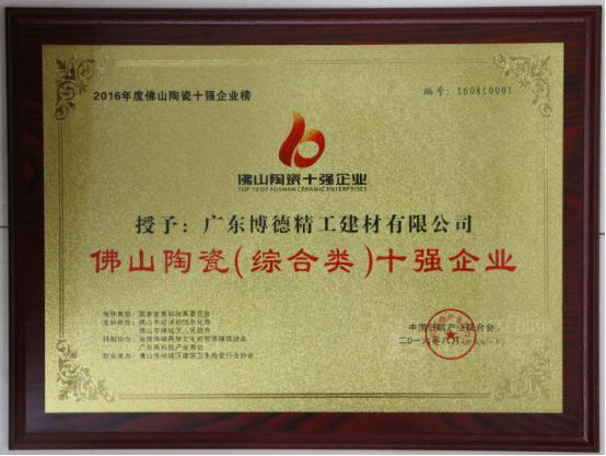2016年8月13日下午,2016年佛山陶瓷十強企業(yè)評選活動于佛山迎賓館召開,這是一次權(quán)威發(fā)布、覆蓋全市、拉動行業(yè)品牌上升的一次創(chuàng)新性的、開拓性的評選,是佛山本土陶瓷品牌一次展示機會!廣東博德精工建材有限公司在本次評選中榮獲“佛山陶瓷(綜合類)十強企業(yè)”稱號,董事長葉榮恒榮獲“佛山陶瓷行業(yè)十大環(huán)保推行者”殊榮。