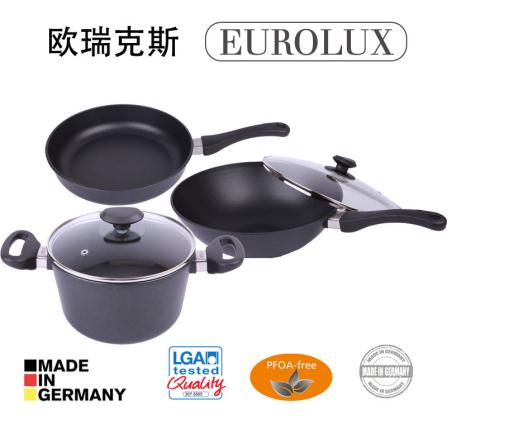 歐瑞克斯Eurolux不粘鍋系列鍋具采用符合歐盟標(biāo)準(zhǔn)的食用級(jí)鋁合金,不含重金屬鉻。鋁制基體厚度8毫米,底盤(pán)厚度10毫米。