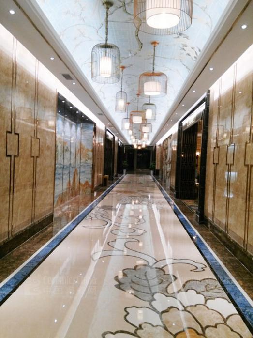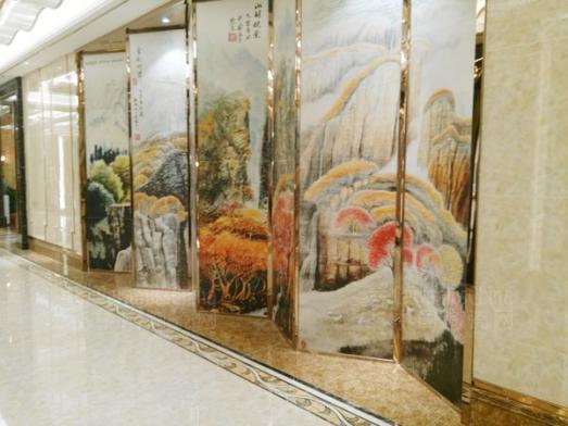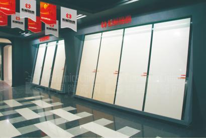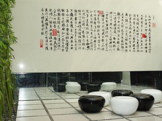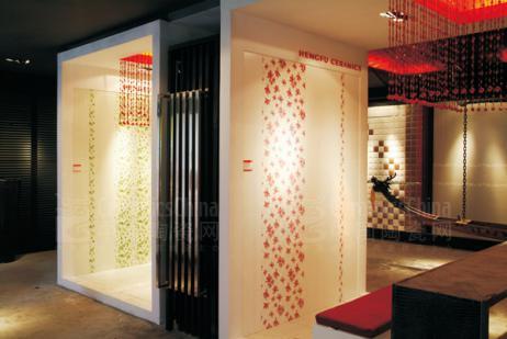 新展廳大量運用了中國山水瓷藝畫、中式屏風、青銅鳥籠燈、不銹鋼窗格等元素來展示瓷磚的藝術(shù)殿堂。走進面積達250平方的中空大堂,左右兩邊的中國山水瓷藝畫相互輝映,加上不銹鋼窗格在旁點綴裝飾,整個大堂格調(diào)高雅,氣勢蓬勃。