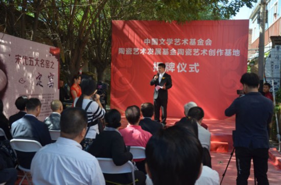 2016年9月28日上午,中國(guó)文學(xué)藝術(shù)基金會(huì)陶瓷藝術(shù)發(fā)展基金陶瓷藝術(shù)創(chuàng)作基地揭牌儀式在宋莊景德鎮(zhèn)瓷藝坊(北京廣余梵樸陶瓷藝術(shù)有限公司)隆重舉行。原中央黨校組織部長(zhǎng)張虎林教授、原中國(guó)工藝進(jìn)出口總公司總裁劉培金、國(guó)家旅游局巡視員鄧宗德、中國(guó)畫(huà)報(bào)協(xié)會(huì)常務(wù)副會(huì)長(zhǎng)兼秘書(shū)長(zhǎng)程更新、中國(guó)收藏家協(xié)會(huì)陶瓷收藏委員會(huì)主任荊志忠、前文化部駐韓國(guó)大使館參贊朱英杰、中國(guó)文學(xué)藝術(shù)基金會(huì)馮曉琳、中國(guó)文學(xué)藝術(shù)基金會(huì)陶瓷藝術(shù)發(fā)展基金主任曹年華、中國(guó)文學(xué)藝術(shù)基金會(huì)陶瓷藝術(shù)發(fā)展基金副主任兼秘書(shū)長(zhǎng)李佩鴻、懸雕瓷畫(huà)藝術(shù)創(chuàng)始人、景德鎮(zhèn)瓷藝坊負(fù)責(zé)人徐初澤、中國(guó)國(guó)際投資促進(jìn)會(huì)副秘書(shū)長(zhǎng)孟凡松、中國(guó)人口福利基金會(huì)唐卡公益基金創(chuàng)始人代英等嘉賓出席了揭牌儀式。
