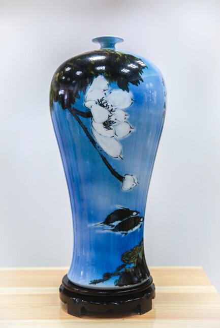 徐美蘭在本次展覽展出的代表作品中。其中蓮塘秋水為顏色釉瓷蓮子瓶,為景德鎮(zhèn)四大名瓷。蓮塘秋水造型典雅,線條流暢,極富質(zhì)感。作品以天藍(lán)色為底色,黑色勾勒輪廓,白色繪成蓮花作點(diǎn)晴之筆。整個(gè)作品釉彩飽滿,張力十足,筆法細(xì)膩,極富想象力,藍(lán)色與黑色的大膽結(jié)合,形成反差美感,將秋水、蓮花躍然于瓶上,賦予陶瓷全新生命力,作品讓人過(guò)目不忘。