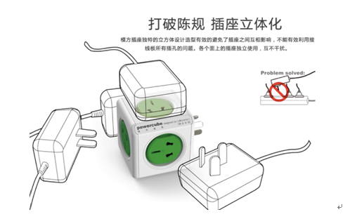 隨著手頭不斷增加著的電子設(shè)備,我們經(jīng)常被各種插頭在插排上“打架”的現(xiàn)象困擾——尺寸不一的充電器無法共存,不能有效利用插座接口。PowerCube(模方插座)的出現(xiàn)就像是插座界的一陣清風(fēng),顛覆傳統(tǒng)排插的外觀設(shè)計(jì),它的每一面都可以被充分利用,避免了傳統(tǒng)排插插頭間互相打架的尷尬局面,為插座界帶來了一種全新的洪荒之力。該產(chǎn)品2014年獲得德國(guó)紅點(diǎn)設(shè)計(jì)獎(jiǎng),其設(shè)計(jì)公司阿樂樂可工業(yè)設(shè)計(jì)有限公司,是一群由荷蘭代爾伏特理工大學(xué)工業(yè)設(shè)計(jì)畢業(yè)生們成立的創(chuàng)意設(shè)計(jì)公司,以模方插座的設(shè)計(jì)產(chǎn)品風(fēng)靡全球。
