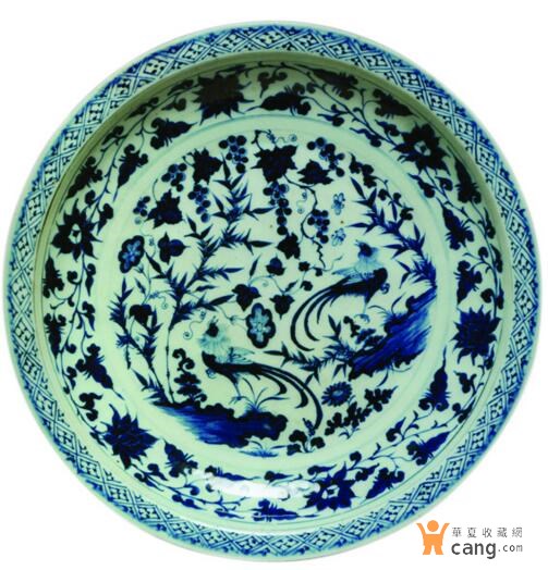 V·A博物館六樓瓷器展廳,玻璃柜內(nèi)赫然擺放著一坨海撈瓷殘片(圖1),應(yīng)屬于我國明代輸出的青花瓷盤,別稱為克拉克瓷。明代早期,瓷器的大量輸出與鄭和八次遠(yuǎn)航有密切關(guān)系。瓷器輸出的另一方式是“入貢”國家使節(jié),回國時(shí)帶回的。對(duì)中國精美的瓷器,世界各國人士愛不釋手,尤其是青花瓷器,幾乎遍及亞、非、歐、美各洲。當(dāng)然中國的制瓷業(yè)也從國外獲得物質(zhì)、技術(shù)和藝術(shù)上的借鑒與幫助。習(xí)近平主席今年1月21日在《伊朗報(bào)》發(fā)表《開創(chuàng)中伊關(guān)系美好未來》一文中指出:“來自伊朗的蘇麻離青和中國的高超工藝結(jié)合,成就了青花瓷的雅致。”元青花瓷器應(yīng)當(dāng)是V·A博物館陶瓷展廳展示的強(qiáng)項(xiàng),元青花展品總計(jì)有七件之多,品種包括龍紋皿系扁壺、牡丹紋八棱大罐、海水紋花口大盤、鴛鴦戲水滿池嬌花口盤、青花雉雞竹石花果紋盤(圖2)等典型標(biāo)準(zhǔn)器。