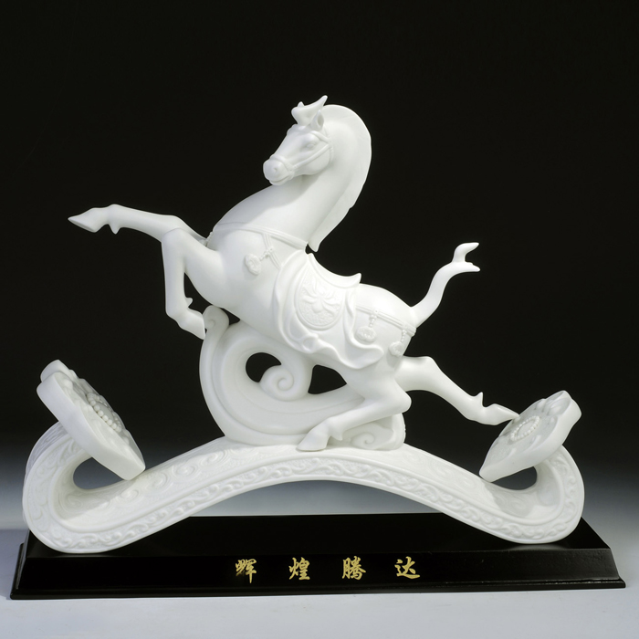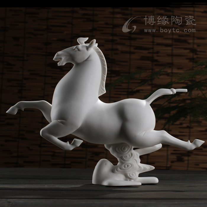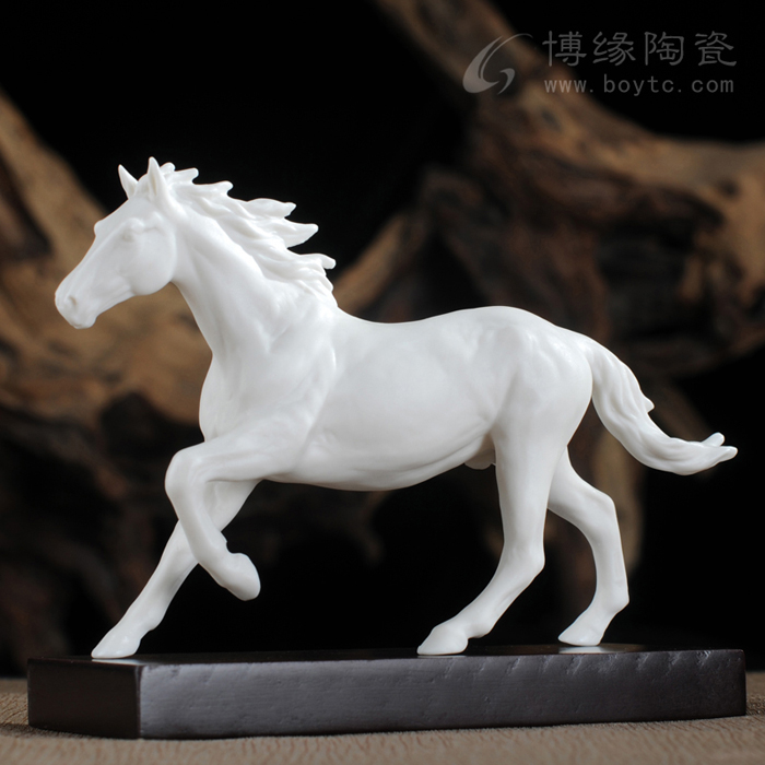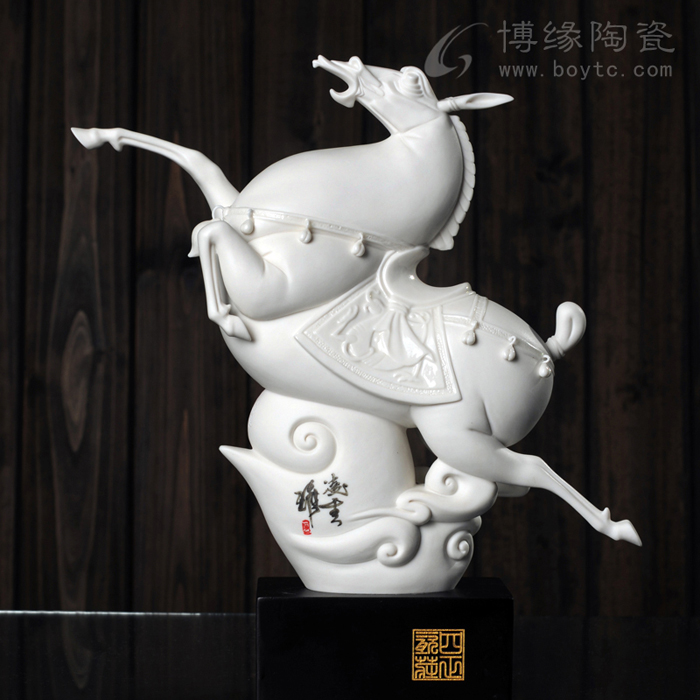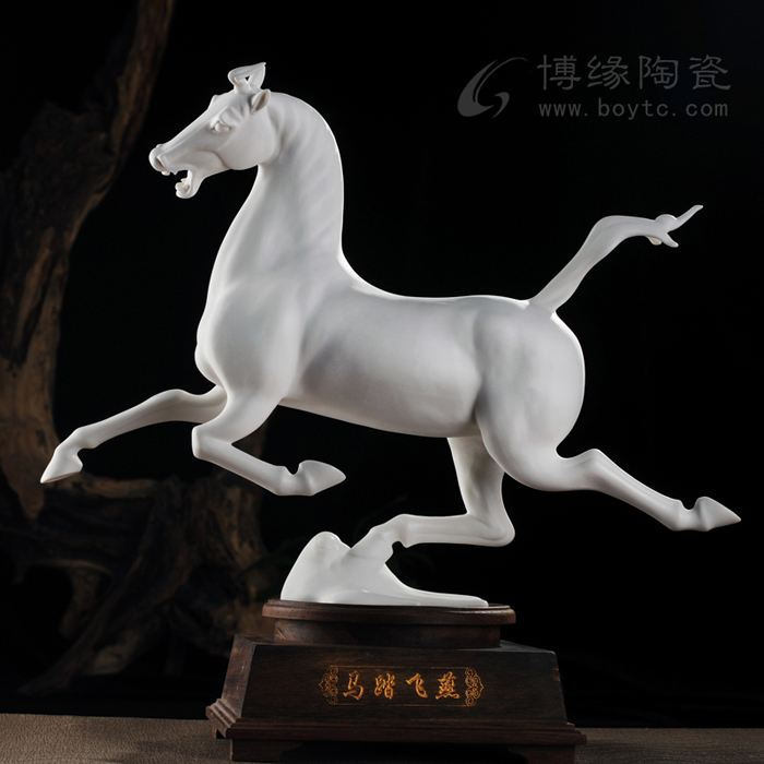 但凡了解瓷塑的人都知道,由于瓷器要經(jīng)過一千多度高溫的燒煉,最高溫時的瓷胎會呈現(xiàn)一種熔融狀態(tài),如果胎體重心不穩(wěn),燒煉中極容易變形甚至癱倒成為廢品,因此瓷塑的底部從工藝角度講,應(yīng)該越敦實(shí)越好。尤其對馬的四條細(xì)長腿,瓷塑家都會盡量避免如實(shí)塑造。這樣四蹄飛揚(yáng)的瓷馬----四只翻飛的馬蹄都交代得清清楚楚,站立得穩(wěn)穩(wěn)當(dāng)當(dāng),實(shí)屬難能可貴!