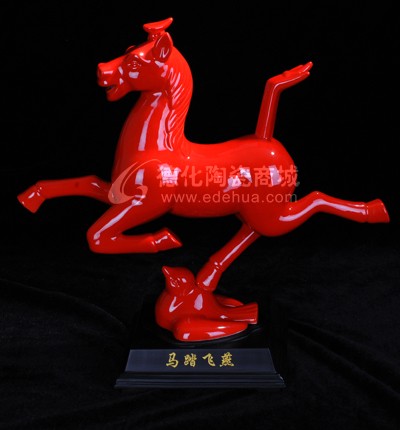 “馬踏飛燕”原文物是一件青銅器,青銅質(zhì)材單腿曲立當(dāng)然就沒有工藝難度,何況不經(jīng)火燒。而這件瓷塑“馬踏飛燕”,造型精準(zhǔn)不說,居然靠著一條細(xì)而彎曲的腿撐住了馬的碩大身體,并經(jīng)過千度以上高溫火的洗禮而毫無失重感,簡直讓人不可思議!