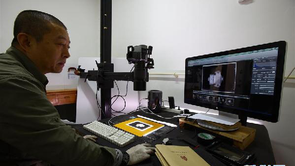 故宮工作人員采集清理清宮老照片玻璃底片(資料照片)。故宮博物院經(jīng)過三年藏品清理工作,增加了55132件登記藏品,涉及乾隆御稿、尺牘、甲骨、陶瓷等種類文物、標本。這些新“上戶口”的藏品已于3月15日起在延禧宮展覽